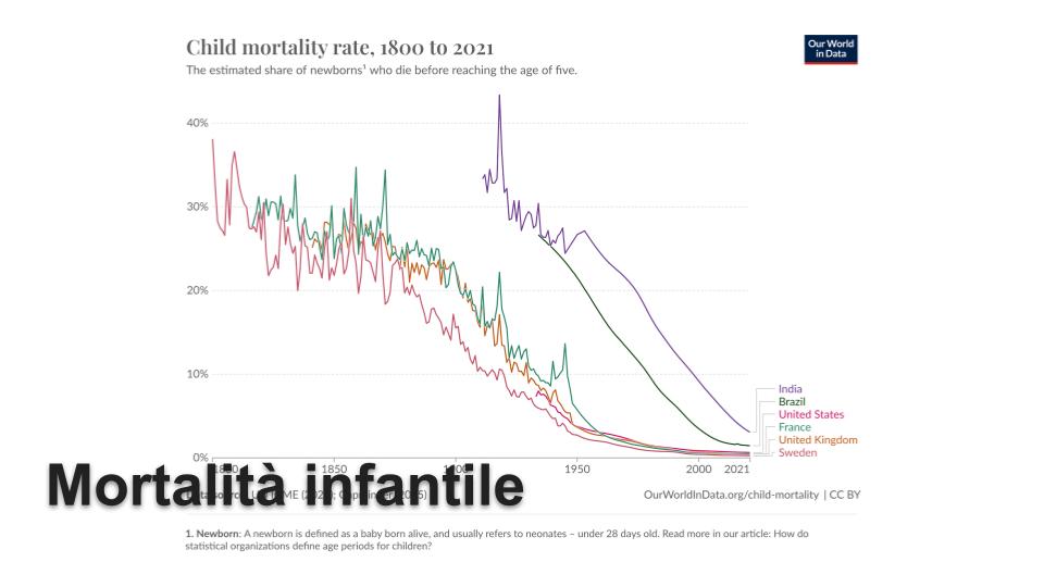 Le trasformazioni che ci hanno coinvolto sono così profonde da rendere irriconoscibile il mondo. Ma anche il mondo del passato ha delle caratteristiche che lo rendono irriconoscibile a noi. Our World in Data mostra il grafico della mortalità materna negli ultimi 200 anni che crolla precipitosamente. Immaginate come doveva essere il mondo in cui una gravidanza rappresentava un pericolo concreto di morte. Con famiglie numerose, immaginate un mondo in cui era quasi garantito che uno dei vostri figli non arrivasse oltre i cinque anni d’età. È un mondo in cui io psicologicamente non riuscirei a identificarmi, proprio non riuscirei a concepire come vivrei in un mondo così.