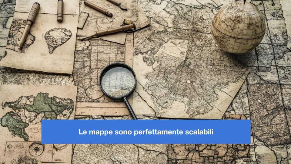Parliamo di scalabilità e delle leggi di scalabilità. Ma cosa significa davvero scalabilità? Esploriamo il concetto di scalabilità partendo dall’esempio delle mappe. Le mappe hanno una qualità unica: dimostrano quello che io chiamo “scalabilità perfetta.” Quando crei una mappa, lo sforzo richiesto per disegnarla è indipendente dalla dimensione dell’area che vuoi rappresentare. Che tu stia mappando una piccola città o un intero paese, decidi la scala, e il processo rimane essenzialmente lo stesso. La densità di informazioni sulla mappa è uniforme, indipendentemente dalla dimensione dell’oggetto reale. Ovviamente, perderai dettagli man mano che aumenti l’area rappresentata. Questa scalabilità perfetta dimostra come i sistemi possano adattare la loro rappresentazione a un livello fisso di sforzo, pur scalando su dimensioni vaste.