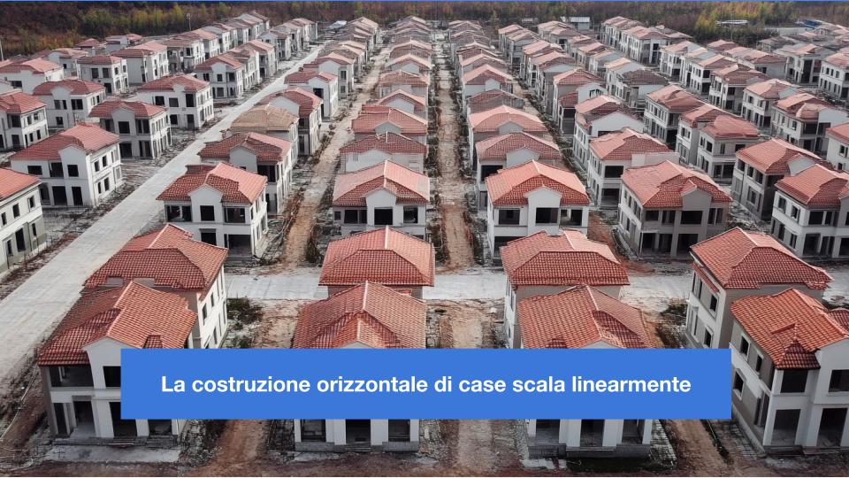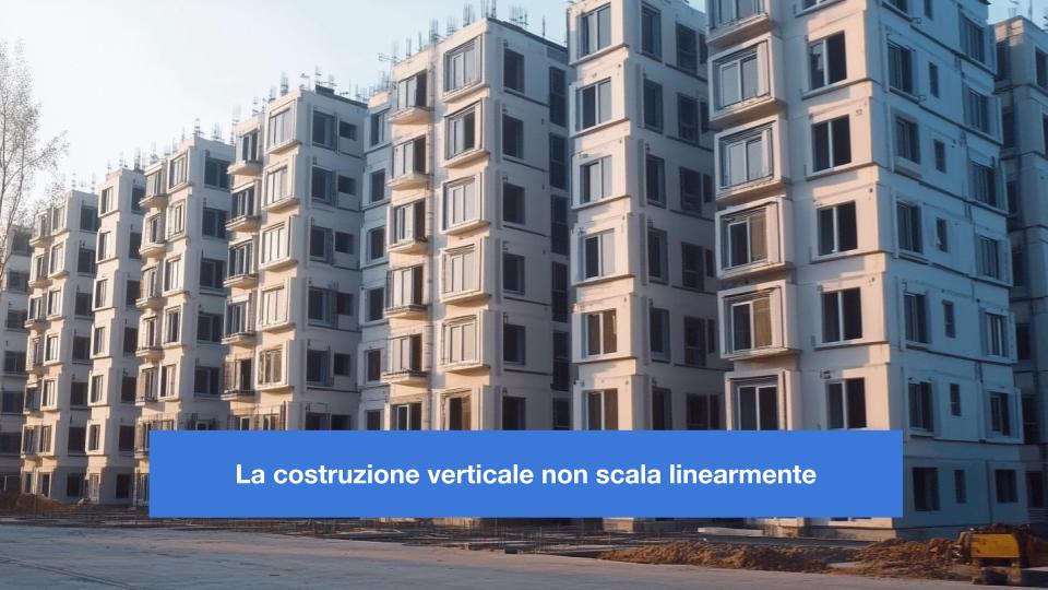 Tuttavia, la scalabilità verticale, ovvero costruire strutture più alte, non si comporta allo stesso modo. Passare da una casa a un edificio di 10 piani introduce complessità non lineari come il rinforzo strutturale, l’uso di nuovi materiali e l’implementazione di sistemi di sicurezza. I costi e le risorse necessarie non saranno 10 volte maggiori, ma molte volte di più. Ancora, se vogliamo costruire un grattacielo di 100 piani, sarà molto più costoso che costruire 10 edifici di 10 piani ciascuno.